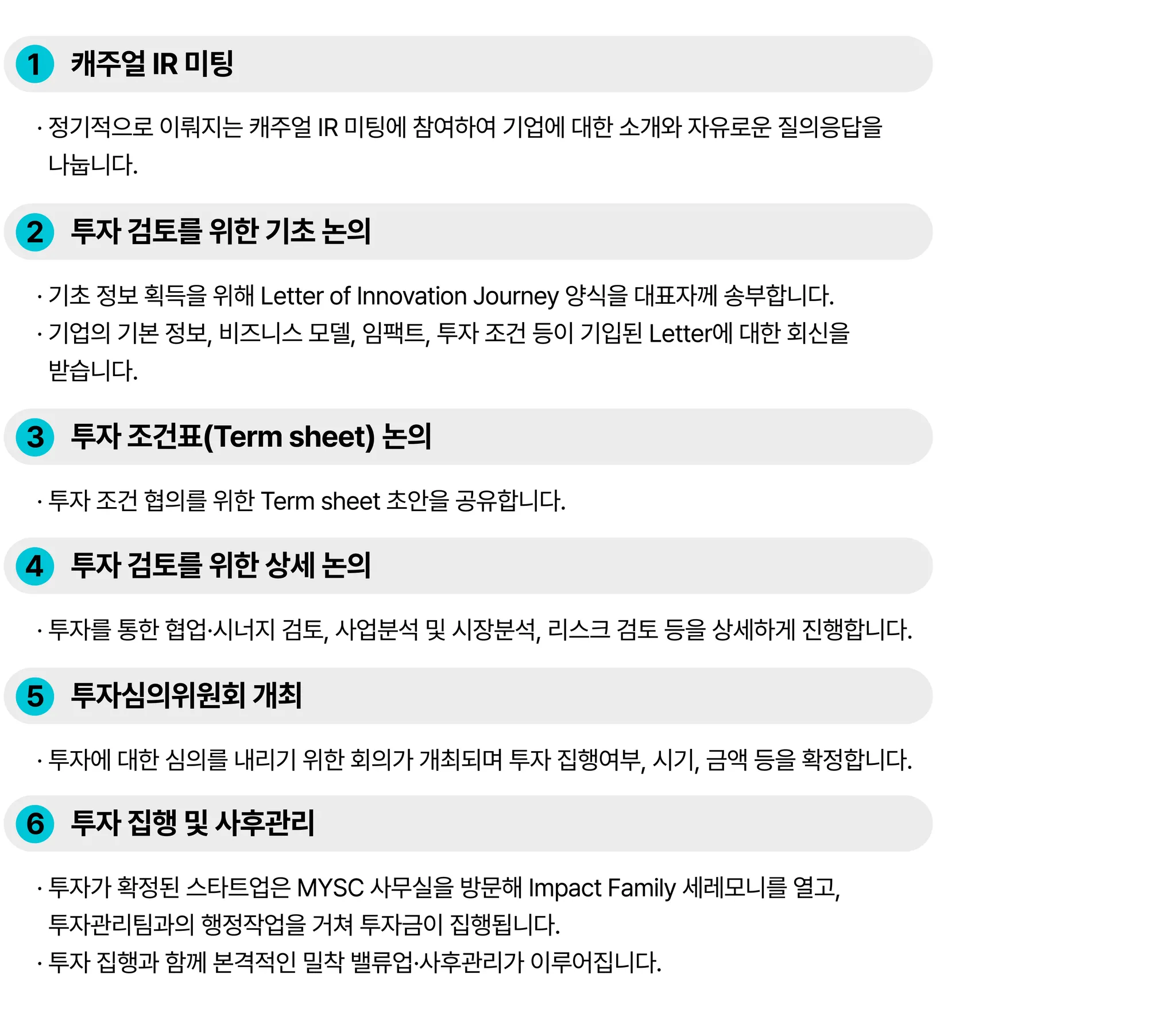 투자 외에도 컨설팅과 액셀러레이팅을 함께 운영함으로써 통합적으로 MYSC만의 가치와 연결의 기회를 제공하고 있습니다. 투자 팀 대상 사후관리 영역을 비즈니스혁신(Innovation), 자금조달(Finance), 협력자원연계(Collaboration) 등의 전략으로 구분하여 가치증진에 힘씁니다. 구체적으로는, 기술 R&D 연계(TIPS), 중견 및 대기업과의 자원 연계, 글로벌 진출 지원 등의 실질적인 지원을 통해 기업의 지속적인 가치 제고와 후속 투자 연계를 돕습니다.