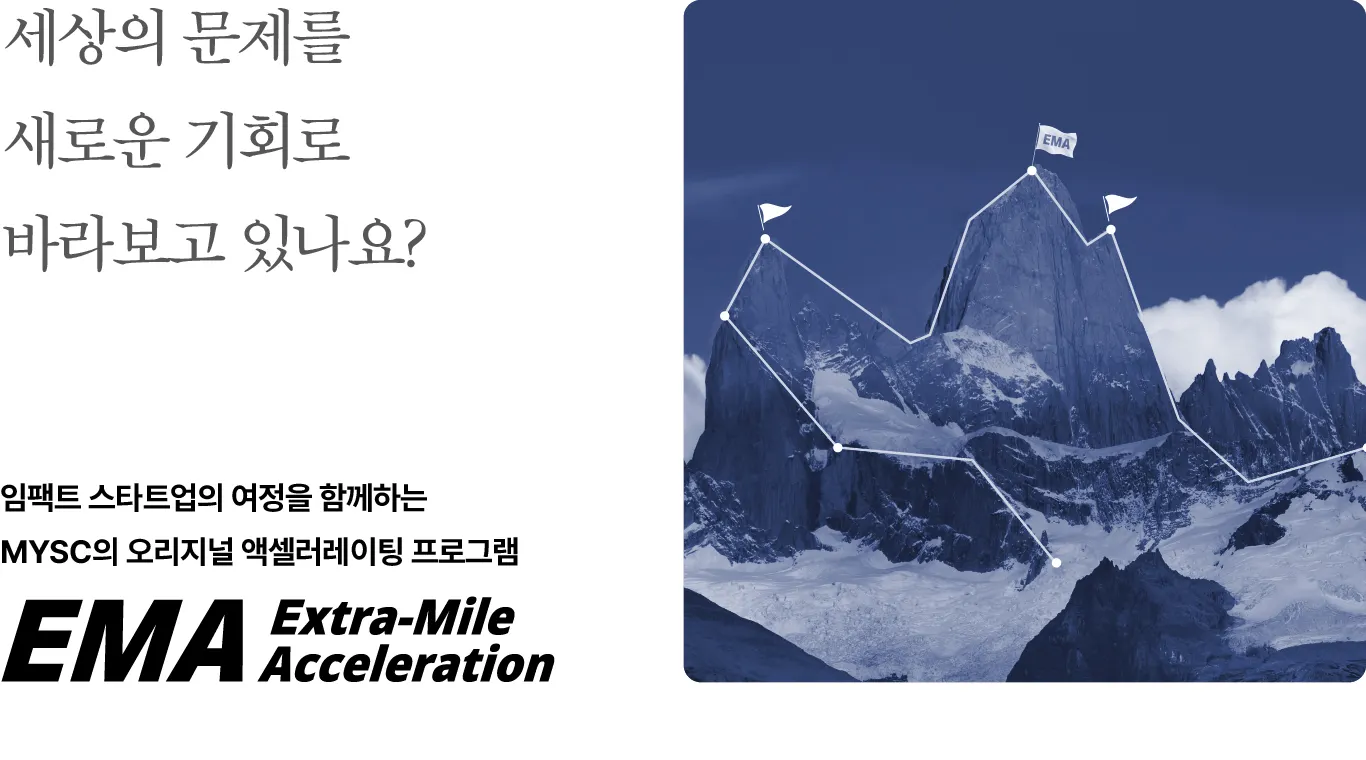 MYSC는 중소벤처기업부에 등록된 전문 액셀러레이터입니다. 스타트업의 비즈니스모델 설계, 솔루션 검증, 그로스해킹, 브랜딩, 임팩트 투자 유치, ESG 경영 및 지속가능성 강화 등 다양한 영역에서 내·외부 전문가들을 연결하고 긴밀하게 협력하여 스타트업의 성장을 든든하게 지원합니다. 우리는 성장 고도화 → 투자 유치 → 고용 창출의 선순환 구조를 만들어내며, 임팩트 스타트업이 지속적으로 확장할 수 있도록 지원하고 있습니다.