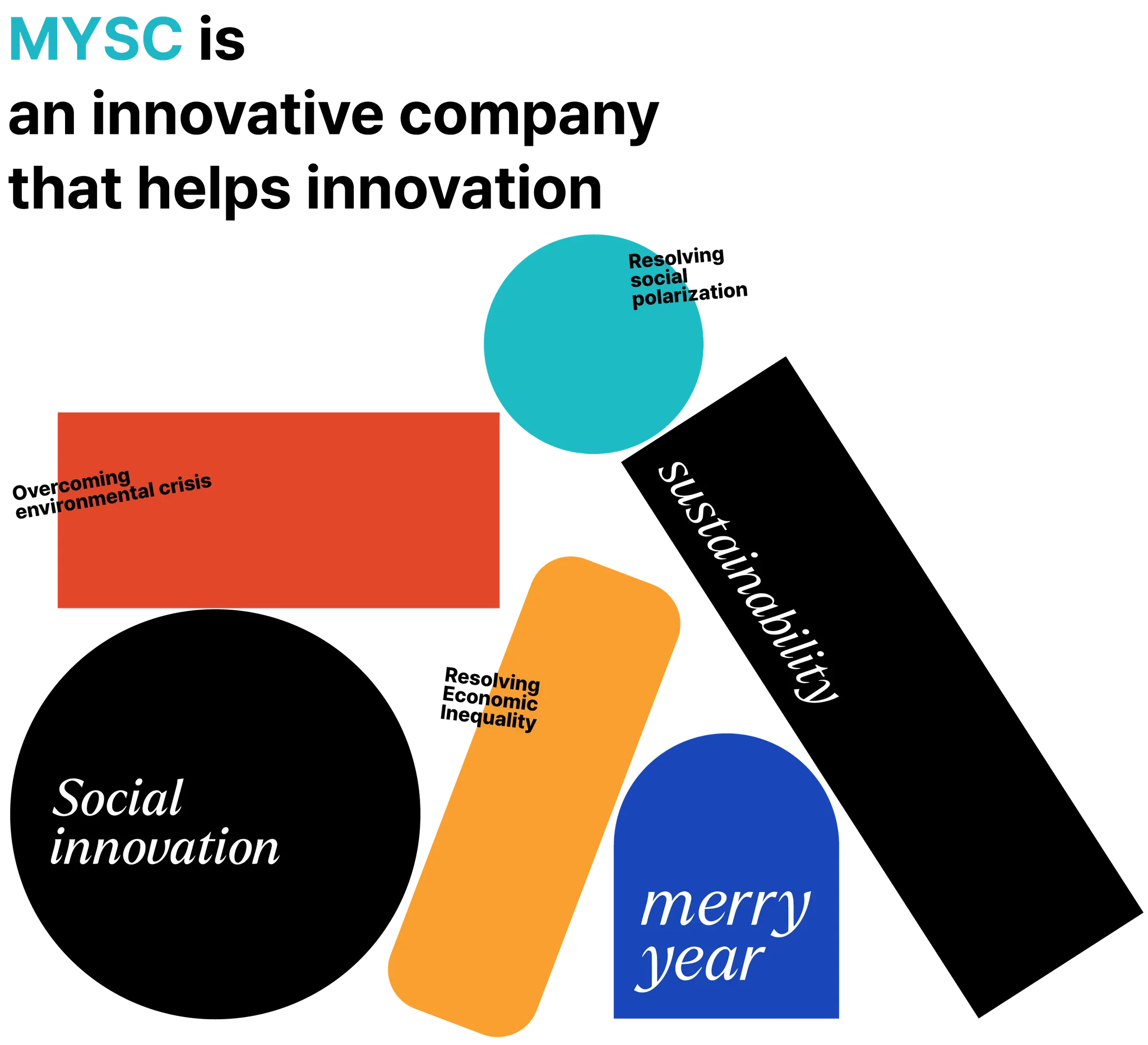The "Merry Year" mentioned in the MYSC (Merry Year Social Company) mission refers to a world where social polarization is resolved and everyone lives like a human being. MYSC contributes to the jubilee that everyone will enjoy. We are in-house entrepreneurs who help entrepreneurs, and we work together to make a better world.